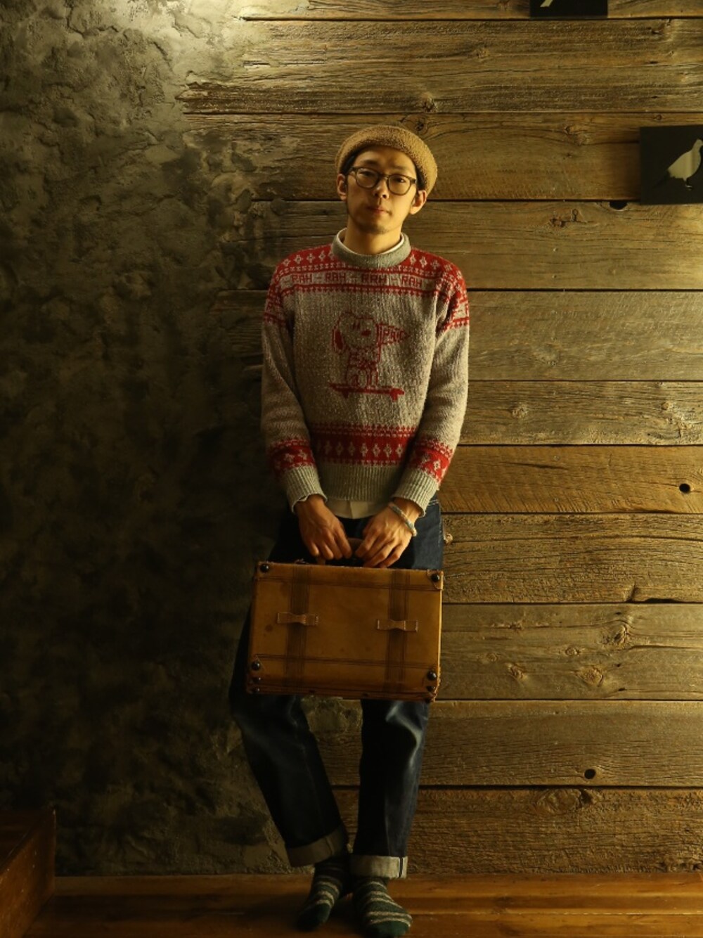 キャップ:CA4LA ニット:vintage ARROW×SNOOPY デニム:KAPITAL 時計:SUUNTO 靴下:靴下屋にて 眼鏡:vintage American optical