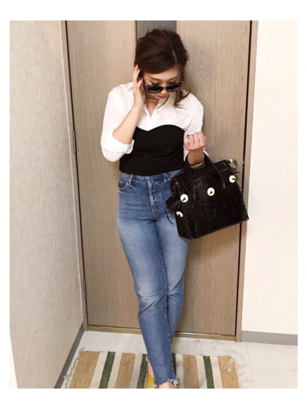 アナザーエディションのビスチェに UNIQLOのシャツ この合わせがしたかったの✨ 今回はinしたから今度はoutして着てみよ