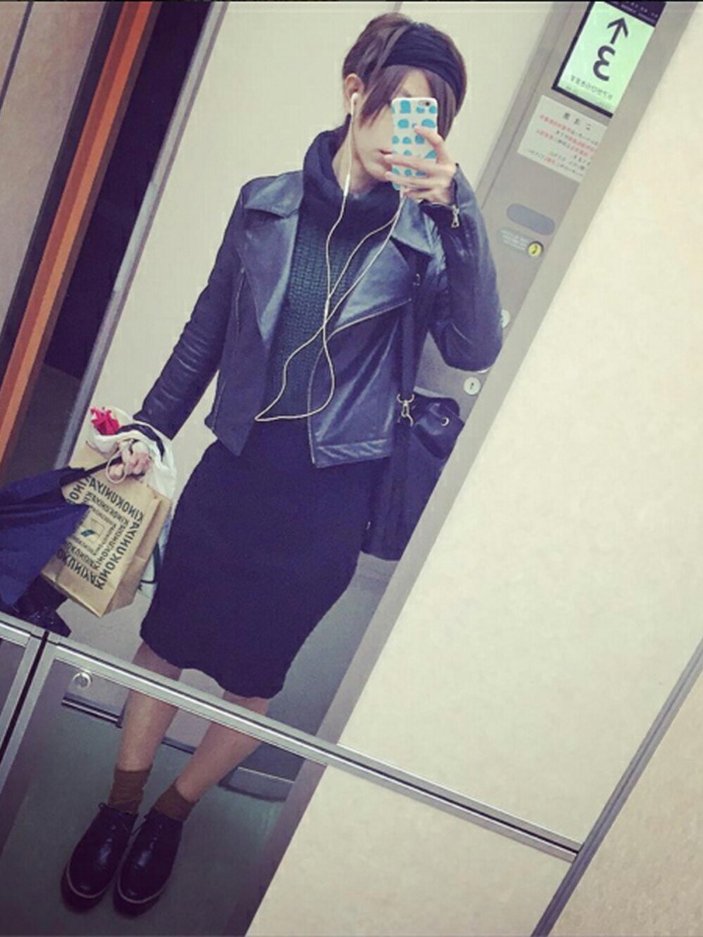 黒ヘアバンド 黒ライダース 深緑ニット UNITED ARROWS 黒ペンシル UNIQLO 黄色レース靴下 黒ドレスシューズ