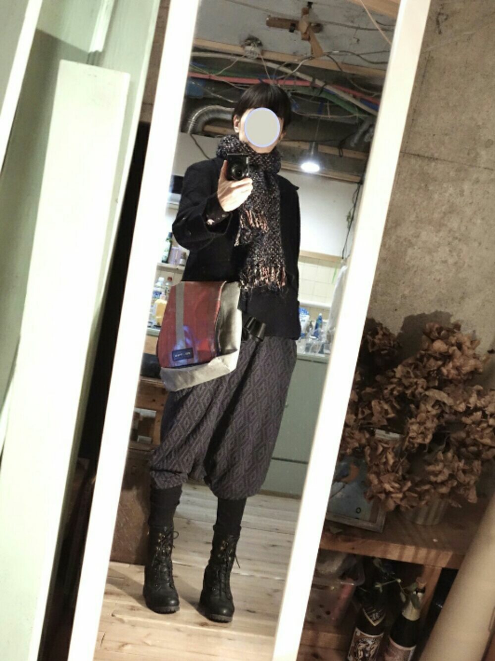 antiquaのこのサルエル、とても使えます🎵 タートルはもちろんブラウス、長袖Tシャツ、Gジャン、ウールのコートとも合いました。 最初はカラーパンプスと合わせていたのですが、ふとブーツを履いてみたら足元がゲートル風で、このスタイルの方が気に入りました☆