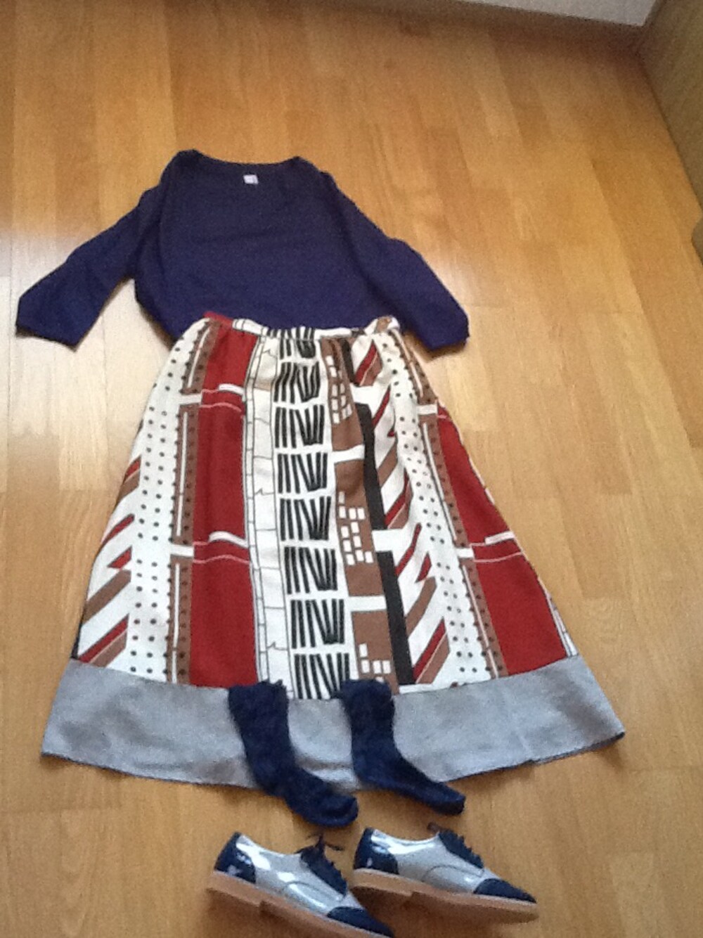 セールで買ったばかりのトップスとスカートです。 スカートの裾は冷たいグレーなので寒色と良く合います。
