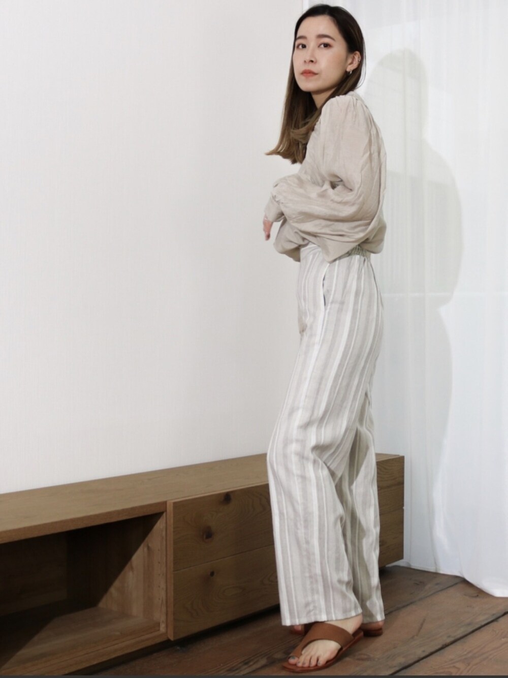 【time sale】 ・ ✔︎ボリュームスリーブプルオーバー G/beige.ivory.black.khaki/free ¥5,696 ・ ✔︎リネンライク ストライプストレートパンツ beige.brown/free ¥5,500 ・ Instagramアカウント→ @per_sist_ence_official