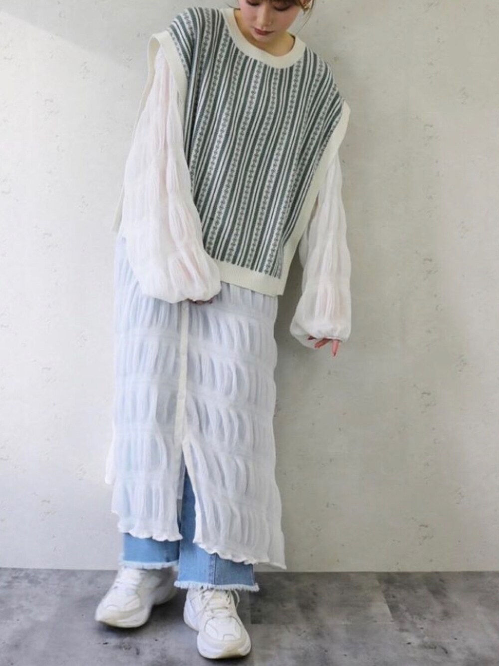 Per sist enceのベスト「Per sist ence/パーシエンス コットンアクリルジャガード クルーネックニットベスト」を使ったコーディネート