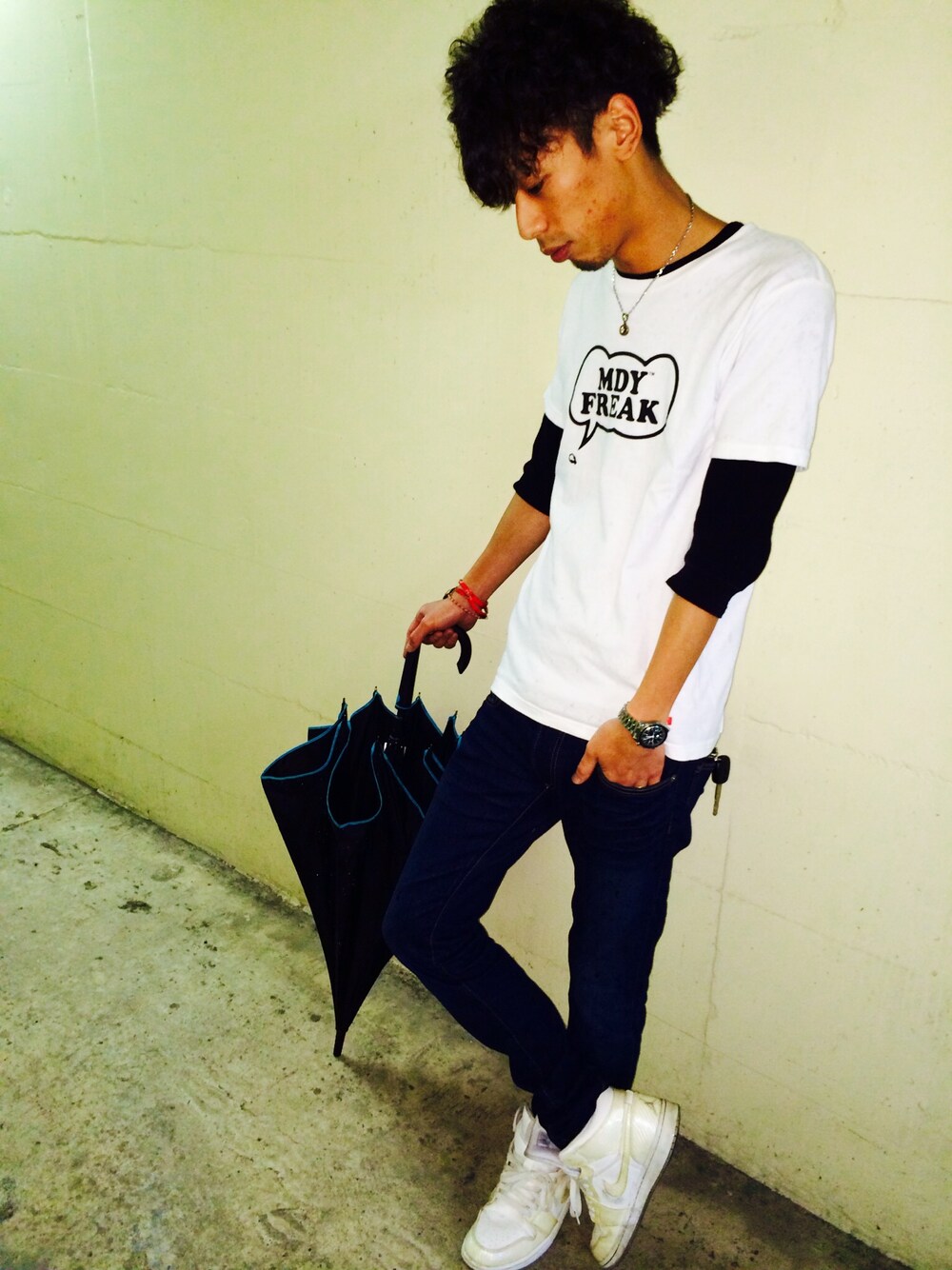 雨の日に撮ったので 傘さしてますが… 今日わなんて暑いんだ‼︎ 今でこの暑さだと 夏が怖いですね♥️ 今回のコーデわ非常にシンプルです( *`ω´) でも基本シンプルな感じが好きです( *`ω´) エアジョーダンはきやすいので ヘビロテしてますが やっぱり白わ汚れやすく 磨くのが大変(´・_・`)