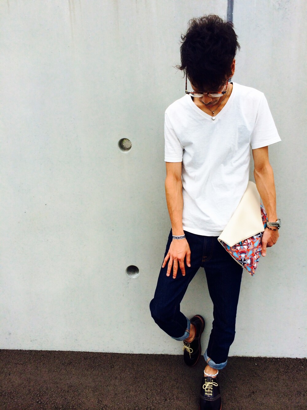クラッチ×メガネ×革靴で 上品にコーデ♪ 無地のTシャツわ 着回しがきくから 便利ですよね( *`ω´) あー 芝まさワールド行きたいなー(´・_・`)
