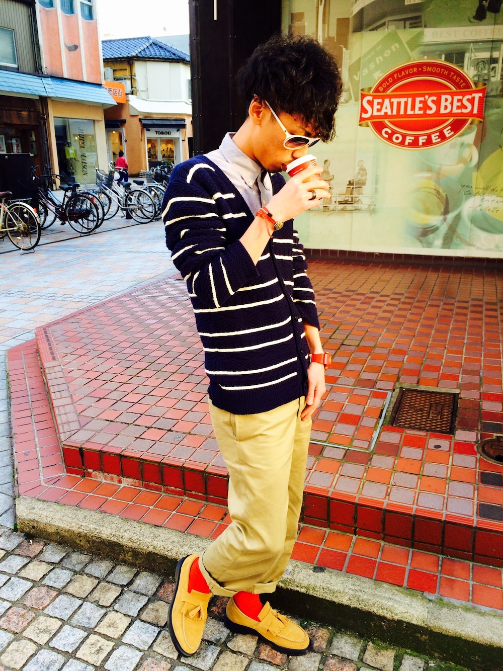 やっと明日から連休だー\(^o^)/ 今回のコーディネートのポイントわ 赤の靴下チラ見せ初挑戦っていうとこですかね(・Д・)ノ そこにコーヒーの赤を合わせました(・Д・)ノ笑 コーヒーで始まり コーヒーで終わる(°_°) そんな毎日を過ごしています(°_°)