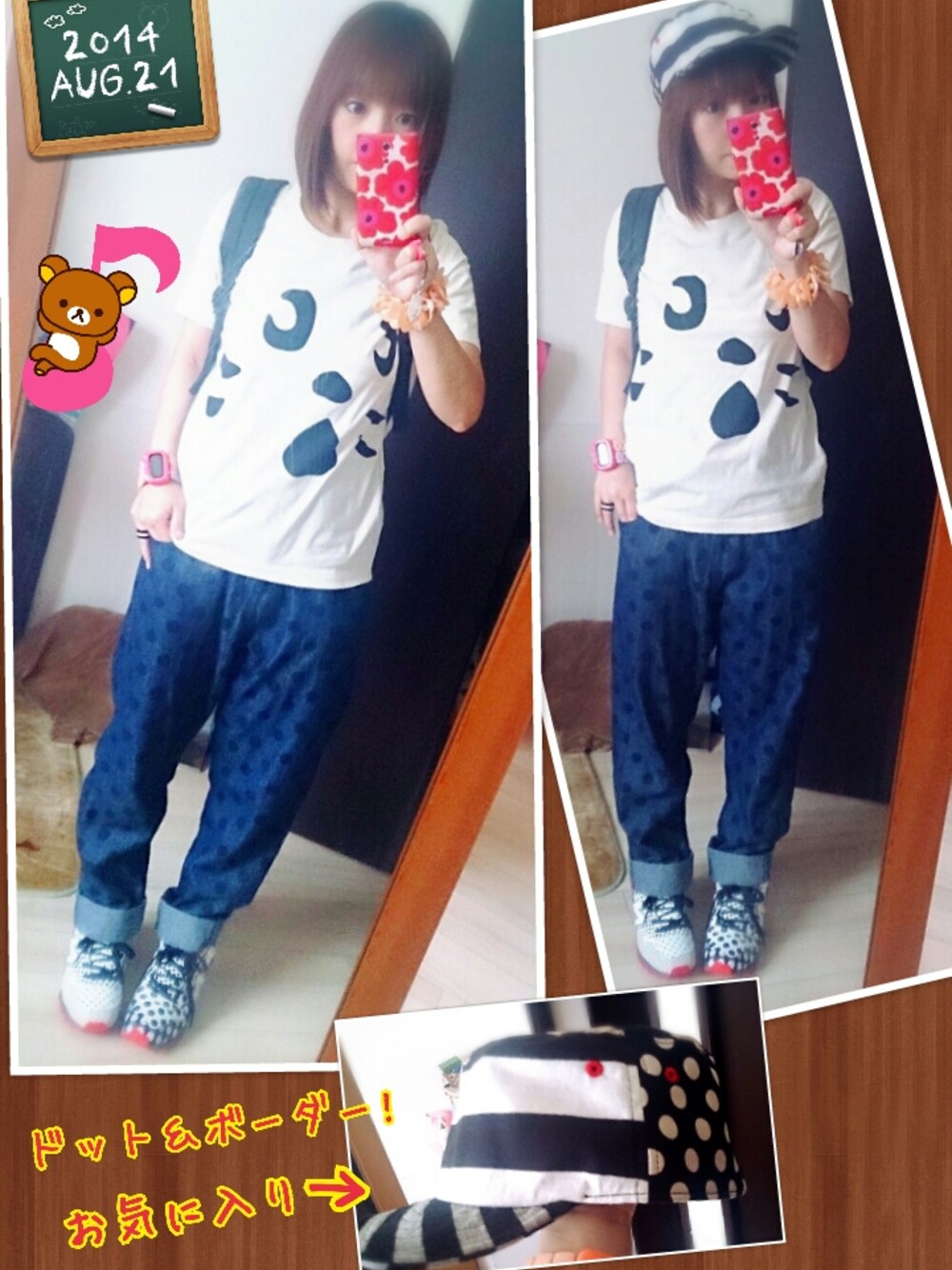 帽子→雑貨屋さん Tシャツ→にゃー ドットデニム→POU DOU DOU スニーカー→フラボア×ニューバランス 時計とリング→ツモリチサト リュック→かなりボロボロになったにゃー フラボアのスニーカーをどんなふうに合わせたらいいかと試行錯誤2日目。 ドットもボーダーも大好きだから、雑貨屋さんで見つけた帽子はお気に入り♪ ただ近所に買い物行っただけの日。