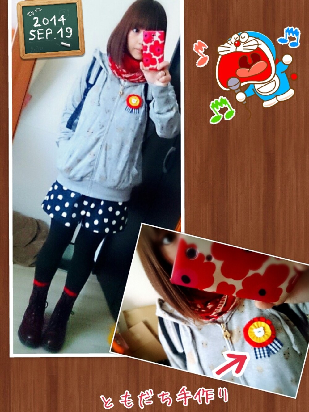 パーカー→ツモリチサト ショートパンツ→フランシュリッペブラック くつ→ドクターマーチン リュック→フラボア 見えないけど靴下→ヴィヴィアンウエストウッド ストール→aikoオソロストール お気に入りの友達手作りブローチ。 寒くてパーカーばっかり。変化が無く見えるなぁ…