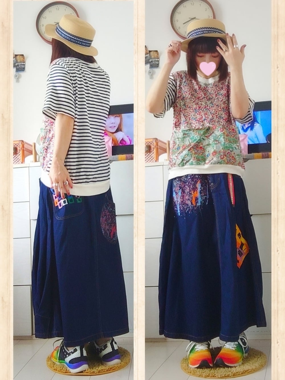 少しずつ夏らしくなってきました。 去年のひどい猛暑はなんだったんだろう…。 ネネットのリバティプリントTシャツにフラボアのダウンズタウンのデニムスカートを合わせました。 スニーカーはフラボア×ニューバランスのもの。 カラフルでずっと気に入ってます。 麦わら帽子もフラボアです。 そして、なんでこんな変なボースかというと…一昨日、ポップアップできているビジュマムさんのリングを2つ買ったからです☆ 月と星のモチーフのリング2つ。 青い地球みたいな石は、スパイニーオイスターターコイズというものです。 可愛すぎて2つともお迎え。 ずっとインスタとかネットショップで見ていたアクセサリーを実際に見て買えて、とても嬉しかったです。