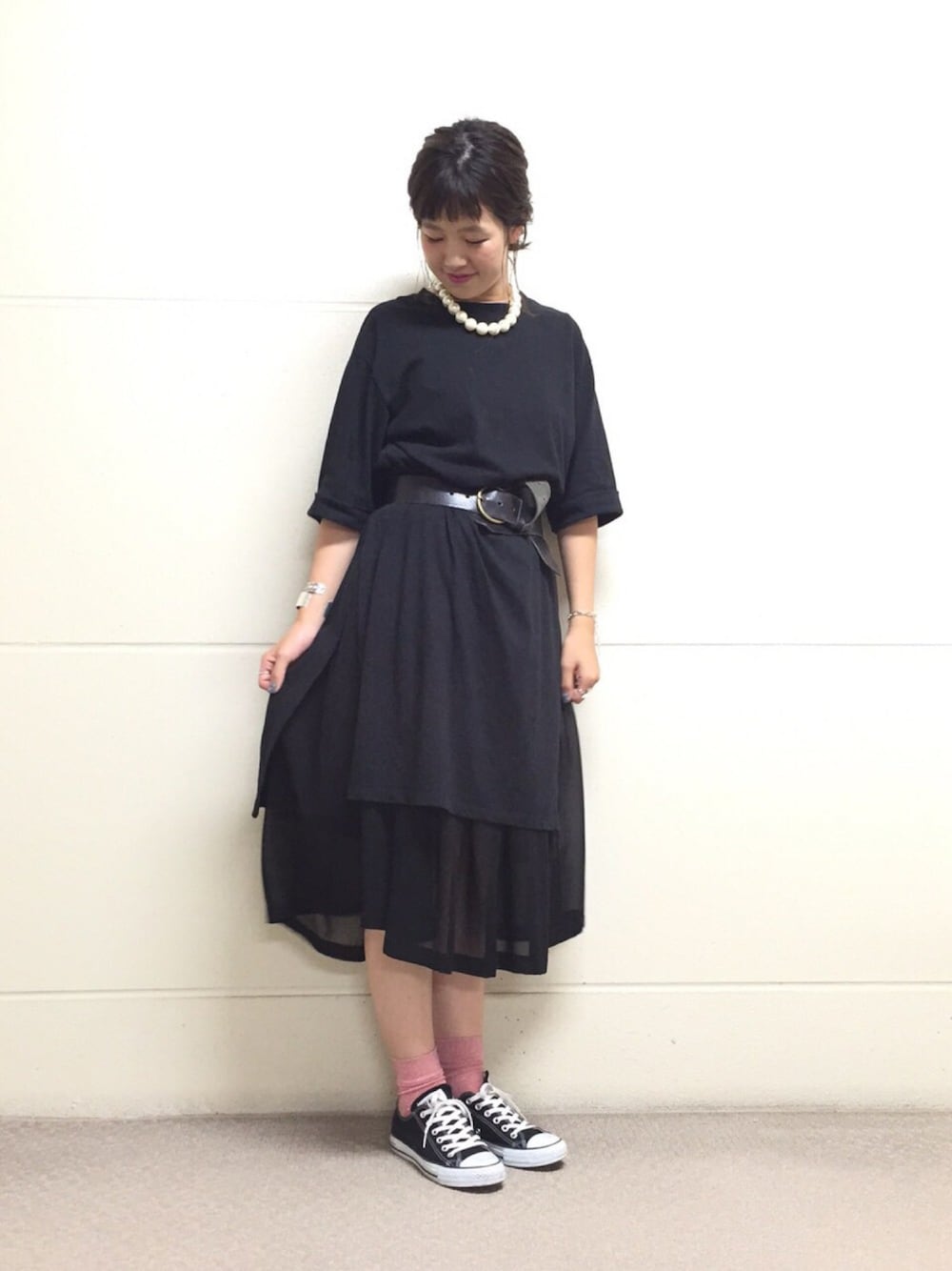 ブラックコーデ♡ カットチュニックにシフォンのワンピースを重ねました♡ ベルトとパールできれいめに、 だけどスニーカーで外して 髪をゆる〜くまとめたコーデ★
