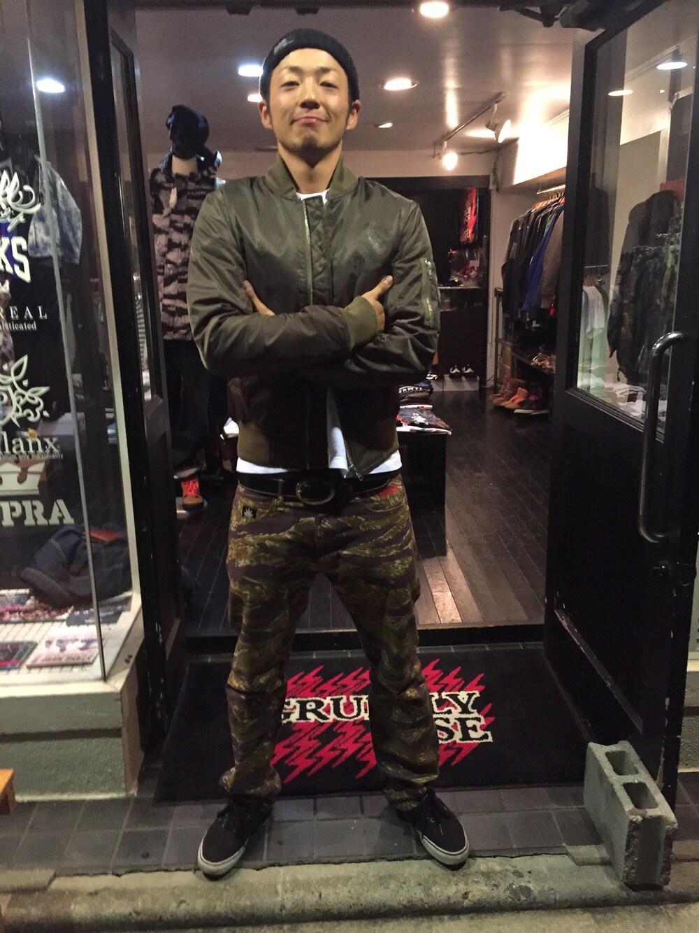 グリーン系のミリタリージャケットを着用したメンズの秋コーディネートの1枚目の写真