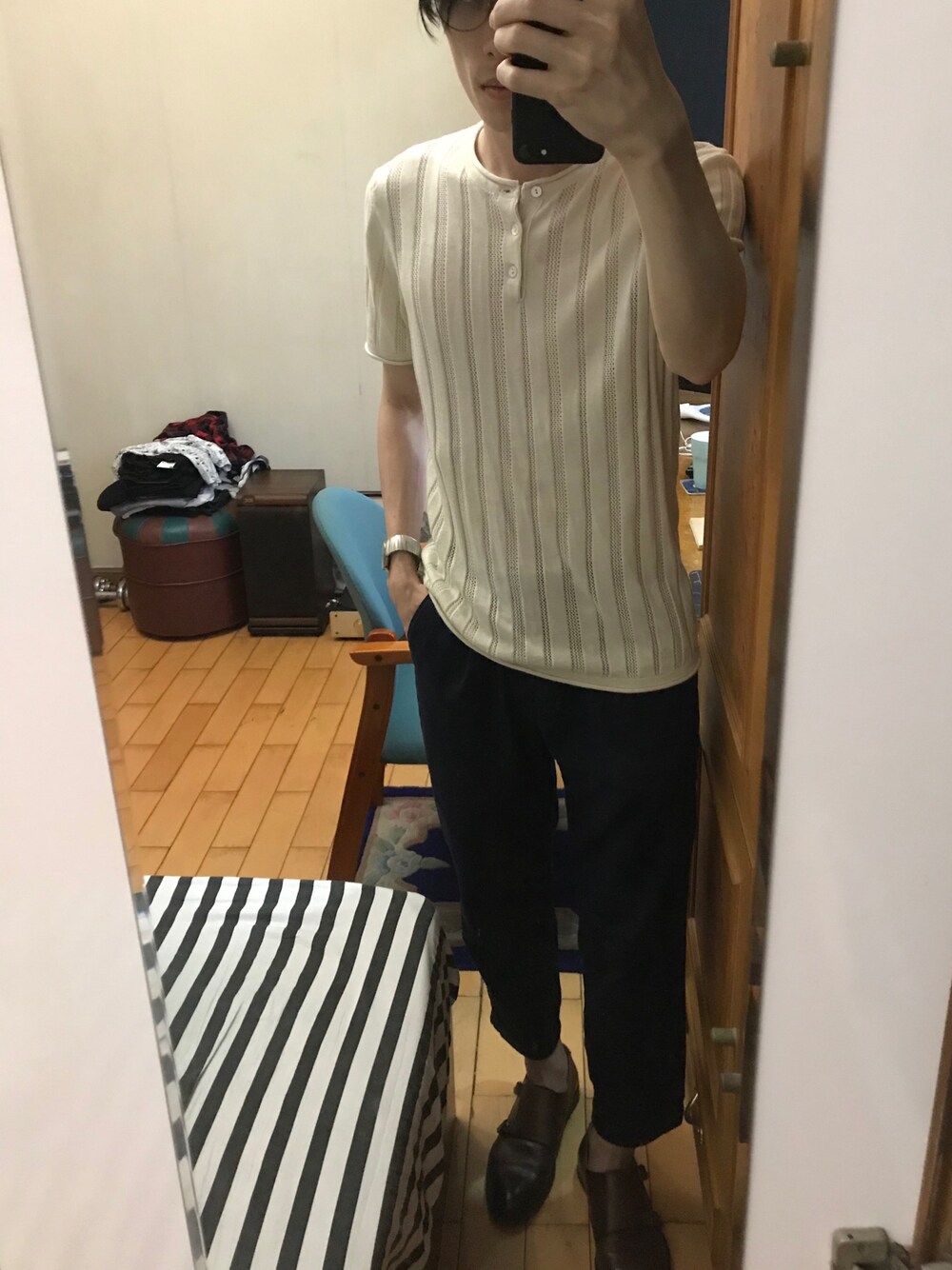 米白色间条透视tee x 深蓝色有闸休闲西装 x 棕色莫克鞋