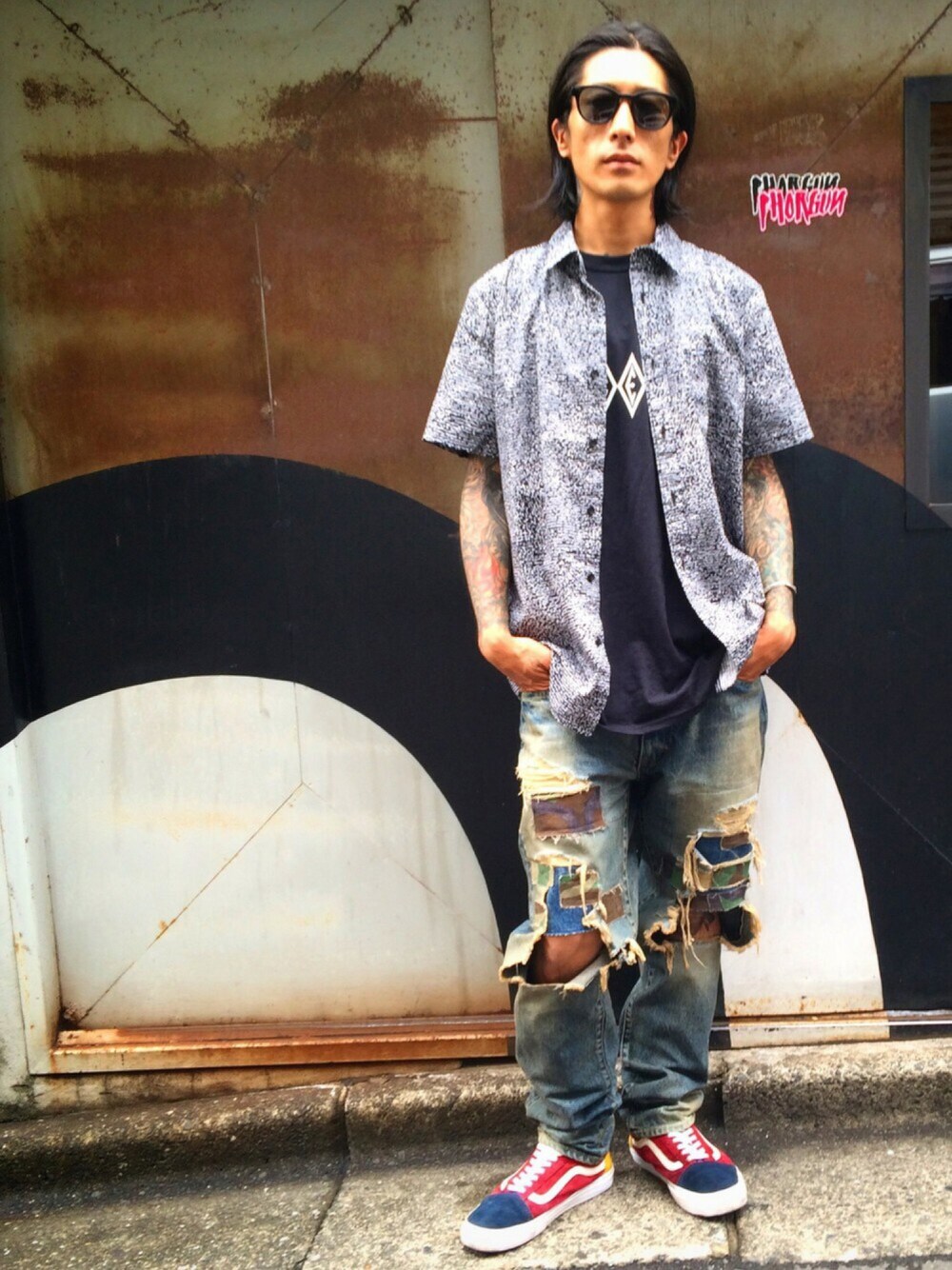 #yuyastyles 本日はVOLCOMのノイズ柄シャツをメインにコーディネート!! NADA.のデニムと合わせて、スニーカーに色味を加えてのストリートスタイルです😎 ちなみに、インナーに着てるSTRESSTYO ってのは僕のブランドです♪ コーディネートのご参考にどうぞ♪