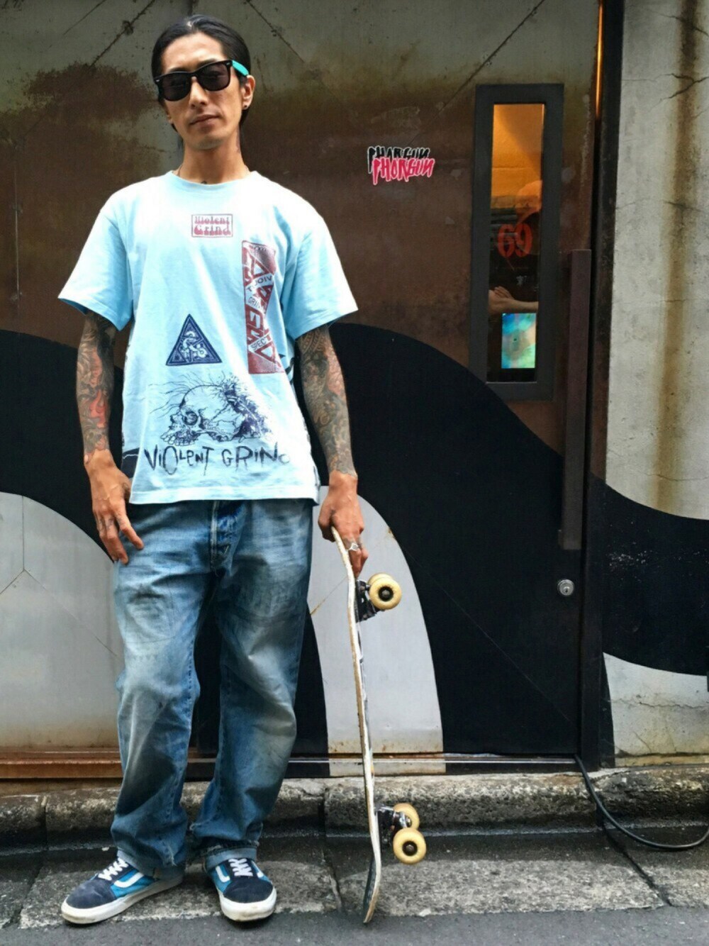 #yuyastyles 伝説的スケートブランド、ViolentgrindのマルチプリントTシャツをメインに、ブルーで統一したコーディネートです!! 爽やか……ではないか💦 コーディネートのご参考にどうぞ♪