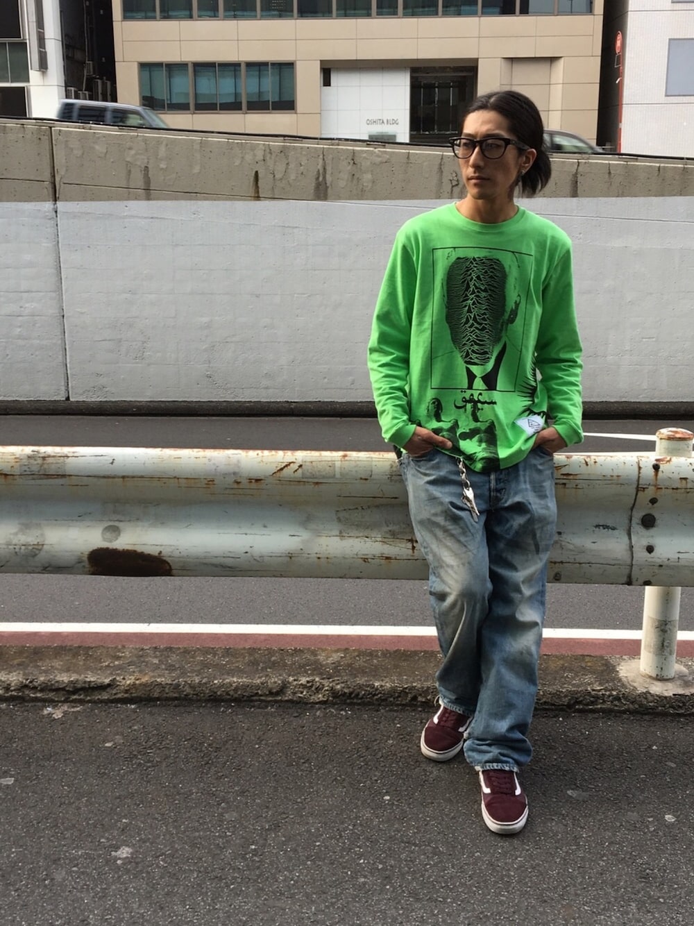 #yuyastyles 今年のマイブームは蛍光色か淡い色!! ロンT一枚でこのパンチ力は最高でしょ🙌 かなり色落ちしたデニムと合わせてパンクテイストに🙌 コーディネートのご参考にどうぞ🙌