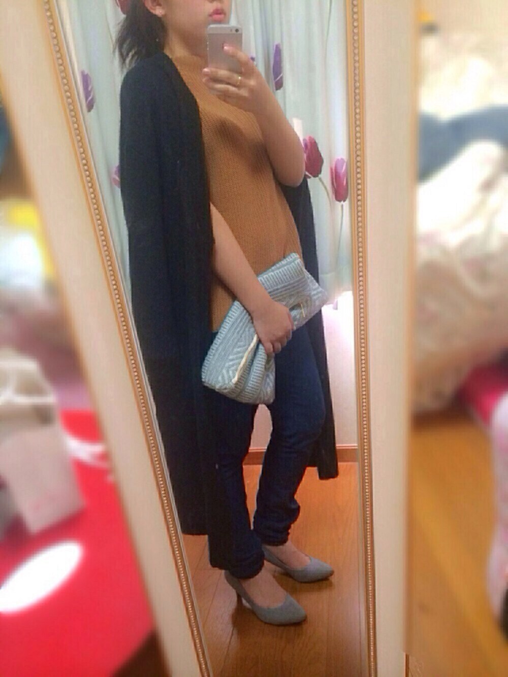 プチプラコーデ🌸 ニットベスト 値下げで 1500円 ロングニットカーデ 値下げで745円 スキニー 1290円 パンプス 300円引きで 2365円 バック SALEで1879円 ピアスセット 637円