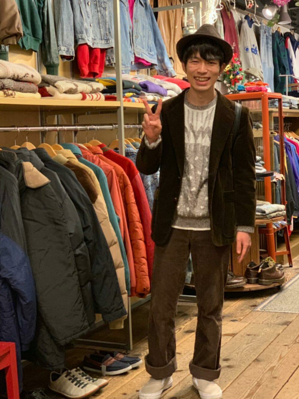 親父がくれたコーデュロイジャケットを使ったブラウンコーデ。パンツはセットアップ風に見えるように探してきたやつ。