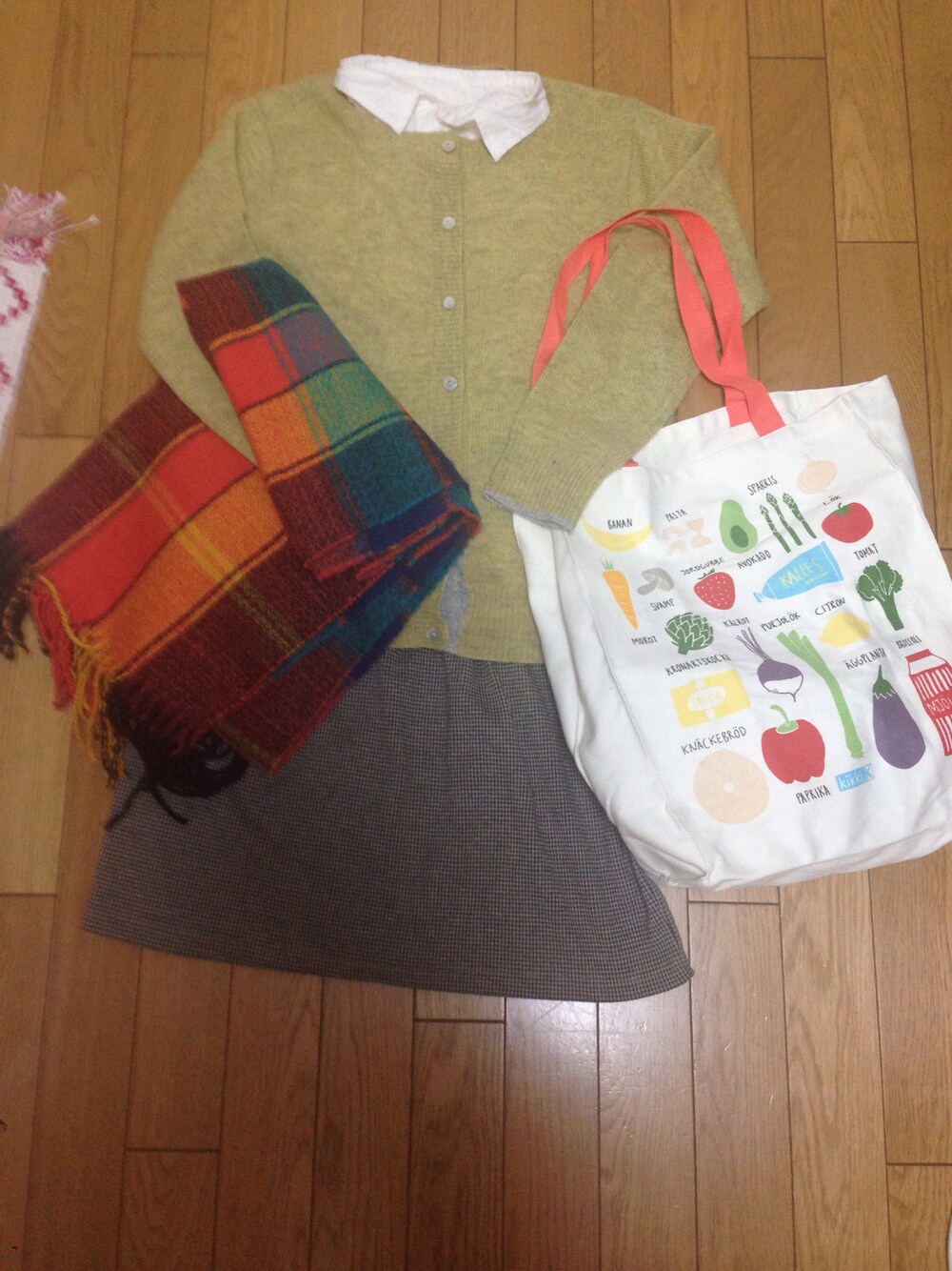 ニット、中のトップス♡sttudio CLIP スカート、マフラー♡Par Avion トートバッグ♡kikki.K 時計、指輪♡equip トートバッグとマフラーを主役に、アクセントになるようコーディネートを組みました。冬の中にも春がちょっと入るように、アクセサリーを明るめに…!