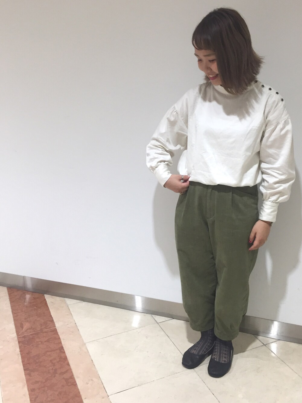 ナチュラルなカーキ×ホワイトの着こなし。 パフスリーブブラウスはボリューム感が○ 配色のボタンがポイント! バレエシューズでちょっときれいな合わせが可愛いです!!