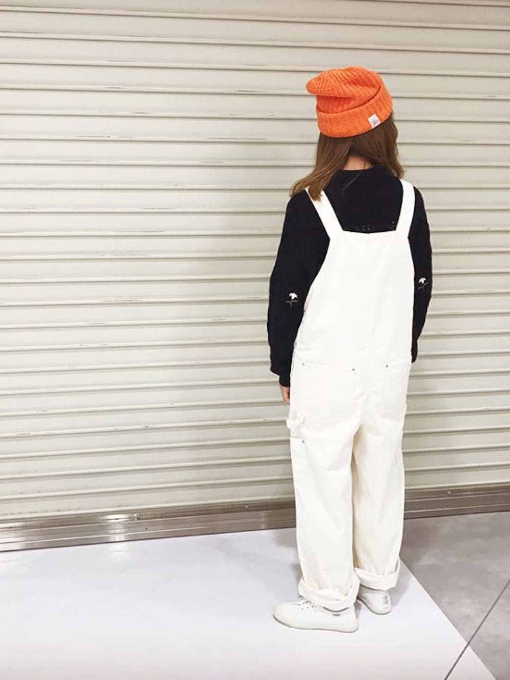 お花の刺繍の甘めなニットをオーバーオール、ニットキャップとカジュアルに合わせた着こなし。 ネイビー・ホワイト・オレンジのパキっとした色が◎ 差し色も勢いが大事です。