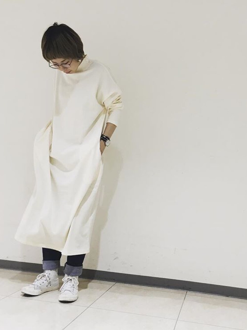 柔らかいカットソーワンピース、ホワイトはデニムと合わせると◎!! ながーい丈なのでぱっと着るだけでさまになります。 小柄な方はベルトでウエストマークするのもオススメです。