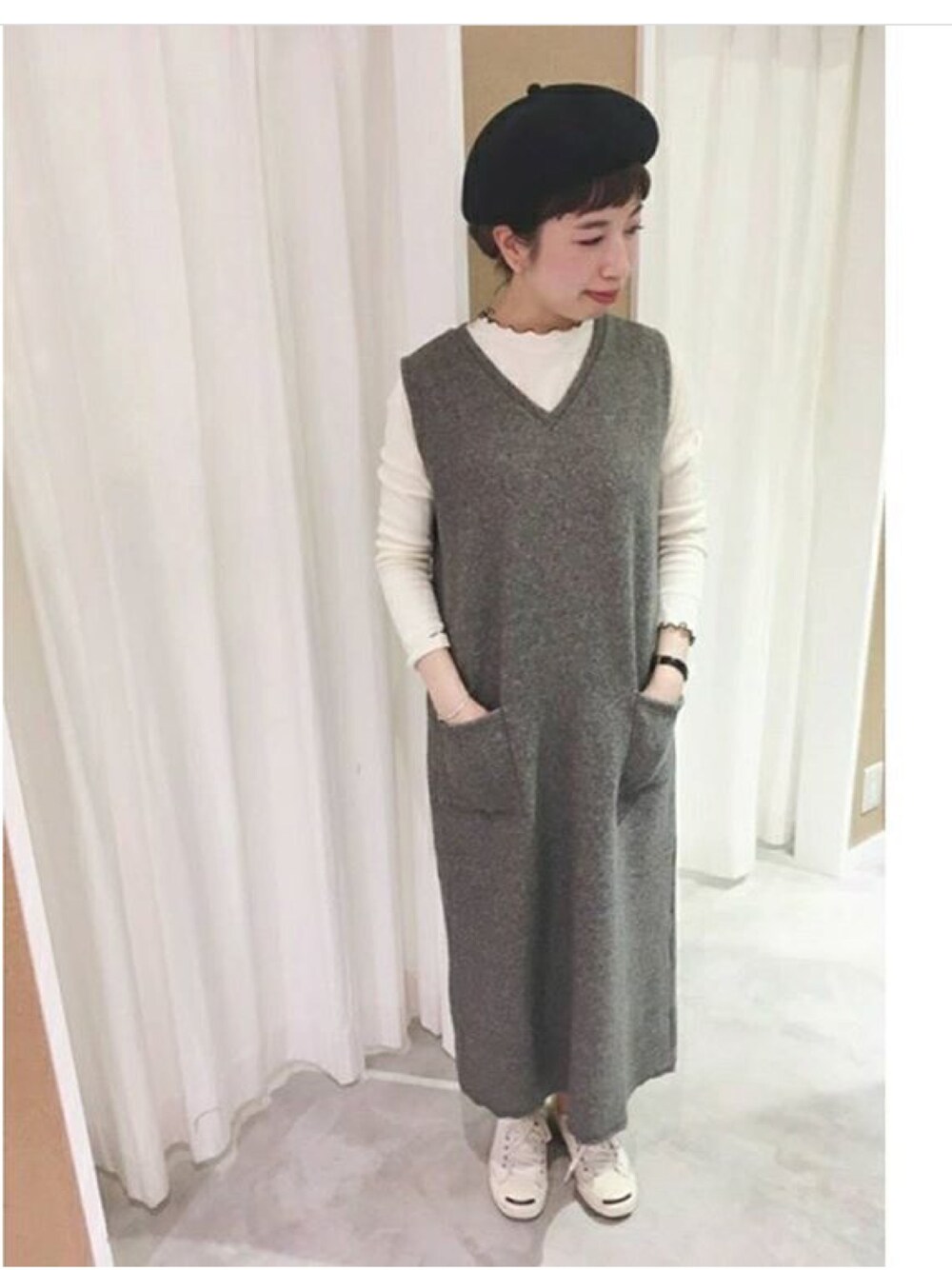 モノトーンのシンプルコーディネート◎ Vネックが女性らしい。 ワンピの下に着ているカットソーはさりげない配色とフリルがかわいいです~!