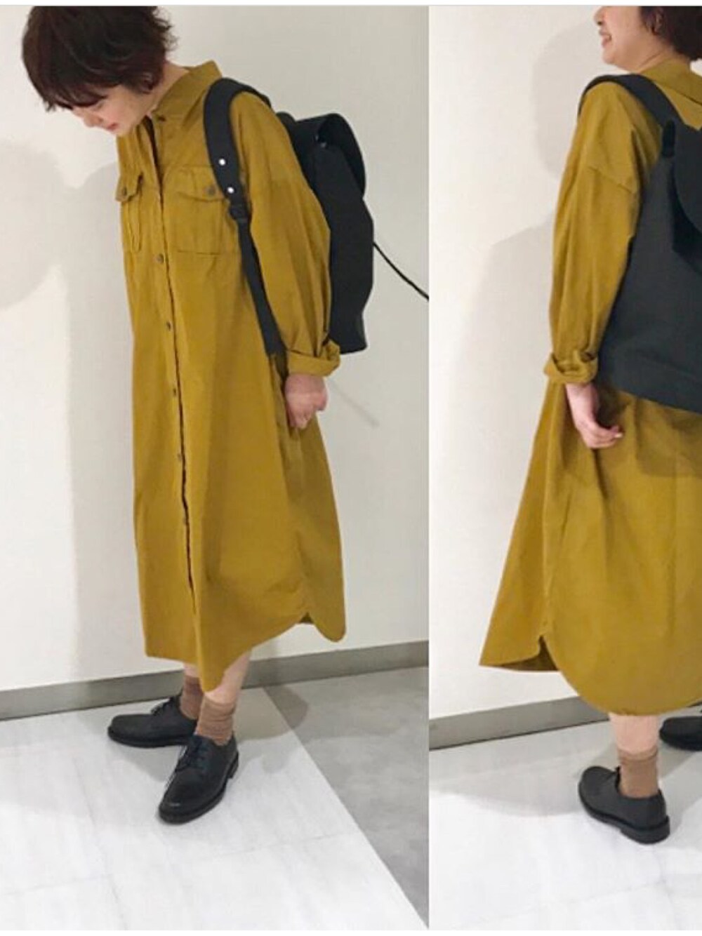 色が素敵なサファリワンピース。 他の色はブラックで統一! シンプルな着こなしでもさまになります。
