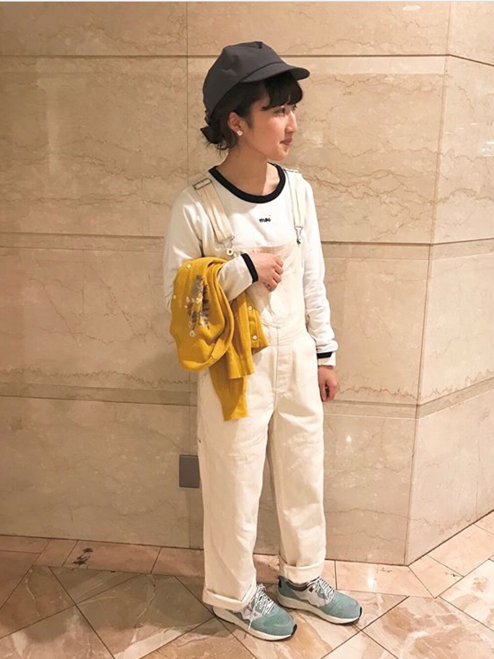 ホワイト×ホワイトの着こなしは、小物で差し色を! ロンTのポップなデザインがポイントです。 胸元にデザインがあるのでオーバーオールとぴったり◎
