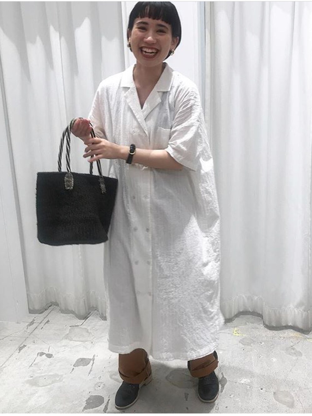 PAR ICI(PAR ICIアトリエ)のシャツワンピース「ドビーチェック×無地 開襟シャツワンピース」を使ったコーディネート