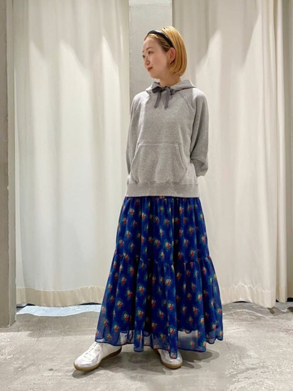 メンズライクな杢グレーのフーディーをかわいらしいギャザースカートで外しました。 パーカーはエルボーパッチが古着っぽくてかわいい。
