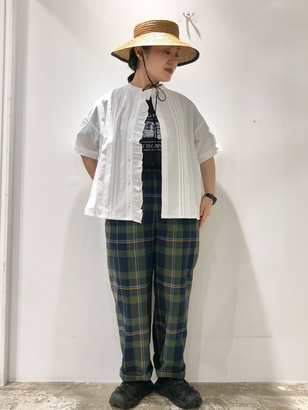 PAR ICI(PAR ICIアトリエ)のシャツ/ブラウス「グランジウォッシュ/ギンガムチェック 前立てフリルブラウス」を使ったコーディネート