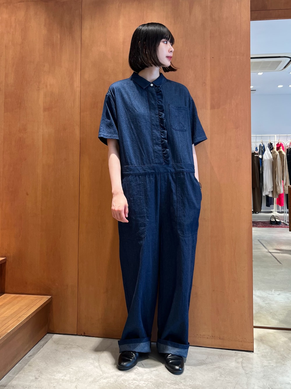 PAR ICI(PAR ICIアトリエ)のつなぎ/オールインワン「【WEB別注】インディゴデニム フリルオールインワン」を使ったコーディネート