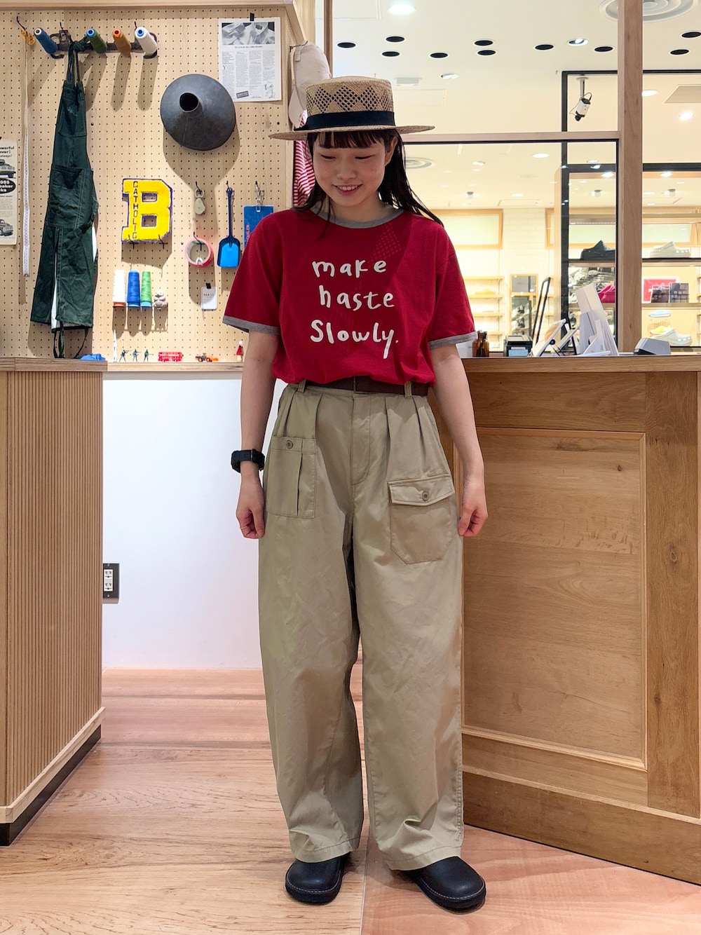 PAR ICI(PAR ICIアトリエ)のTシャツ/カットソー「make haste slowly リンガーTシャツ」を使ったコーディネート