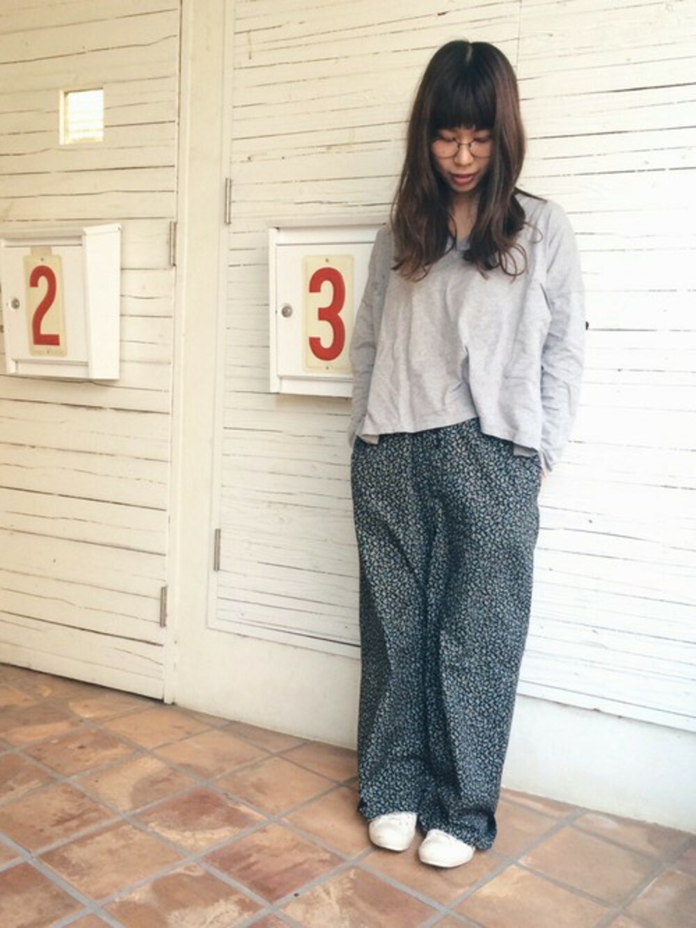 ゆるく着る春の花柄 ゆるトップスとゆるボトム 下ろしたヘアスタイルにぴったり○ 女性らしいVネックがポイントです