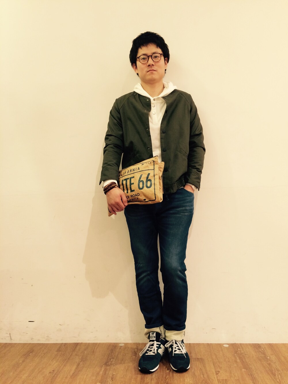 以前撮影したコーデです✨✨ 襟なしのブルゾンなので、パーカーを挟んでみました。 パンツはデニムに見えて実はスウェットパンツです✨
