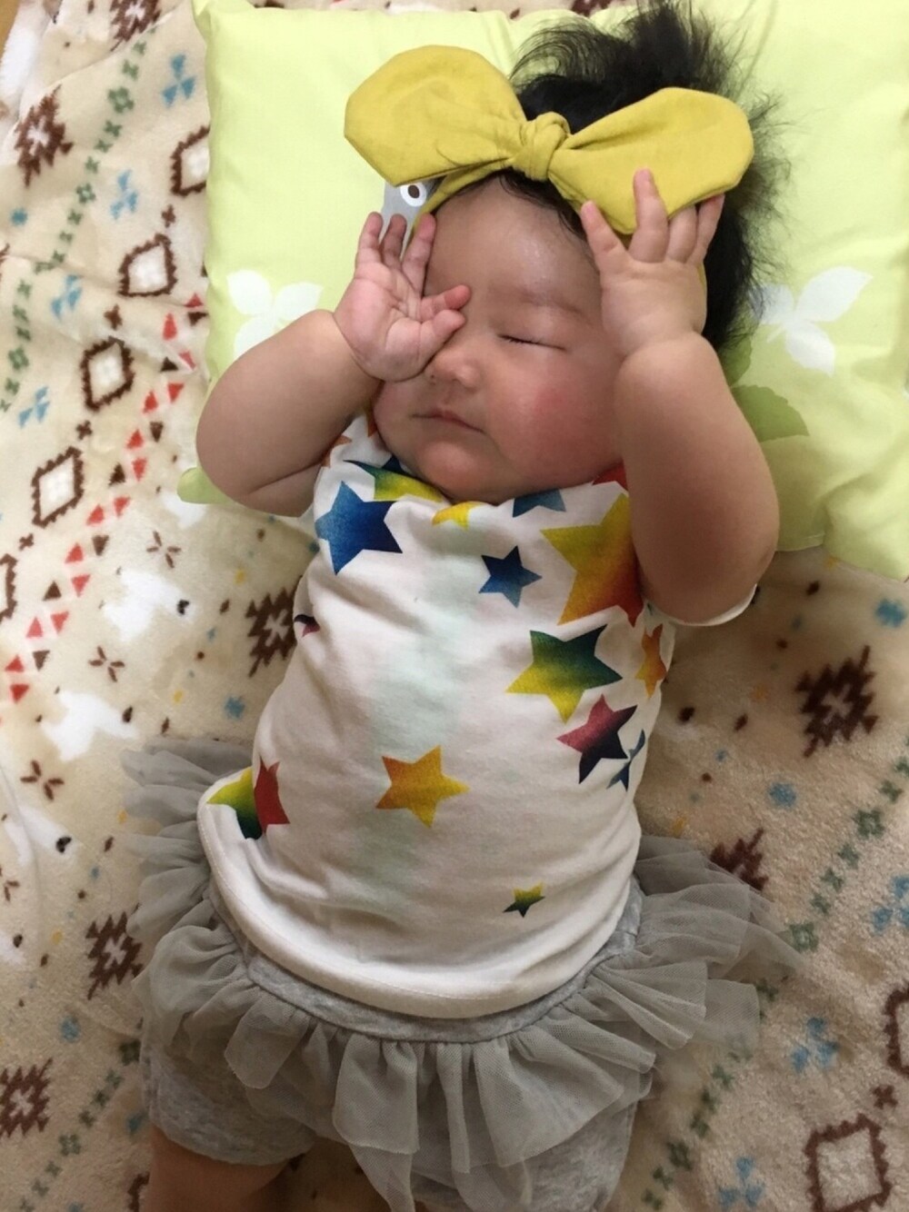 今日もからし色のヘアバンド♡ 昨日よりも2℃くらい暑いそーで… 昨日の夜から黄昏泣き?が始まったのか…ぎゃん泣きのせいで声が枯れてしまってる娘😱 朝から病院行ったけど異常なしで安心したよ😫💦 少々太ってるので喉がゴロついてます🐷 寝返りとかするよーになってスマートになったら改善されるのか…疑問 午前中から病院で疲れたのか、今はイビキかいて気持ち良さそうに寝てます😴 水分補給大事です🙋♂️🙋 皆様、熱中症などには気をつけやんばーい👙