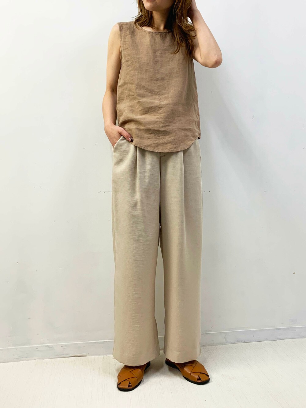 スッキリとしたリネン素材のノースリーブトップスと サラッとした質感のリネンライクパンツ。 リネン素材のトップスは、 フロントはシンプルなデザインになっていて バックにアクセントとしてボタンをプラスされています。 裾がラウンドになっているのでそのまま出した状態でも こなれた雰囲気を演出してくれるアイテムです♡ リネンライクパンツは、 内側の裾はスリットが入ったデザインになっていて ワイドすぎない程よいシルエットがお気に入りです♡ 今年はトップス以外にもワンピースとのレイヤードスタイルにも♪ 他にもトレンドアイテムやこれから使えるアイテム等幅広いテイストをご用意しておりますので、是非覗いてみてくださいね(*^^*)