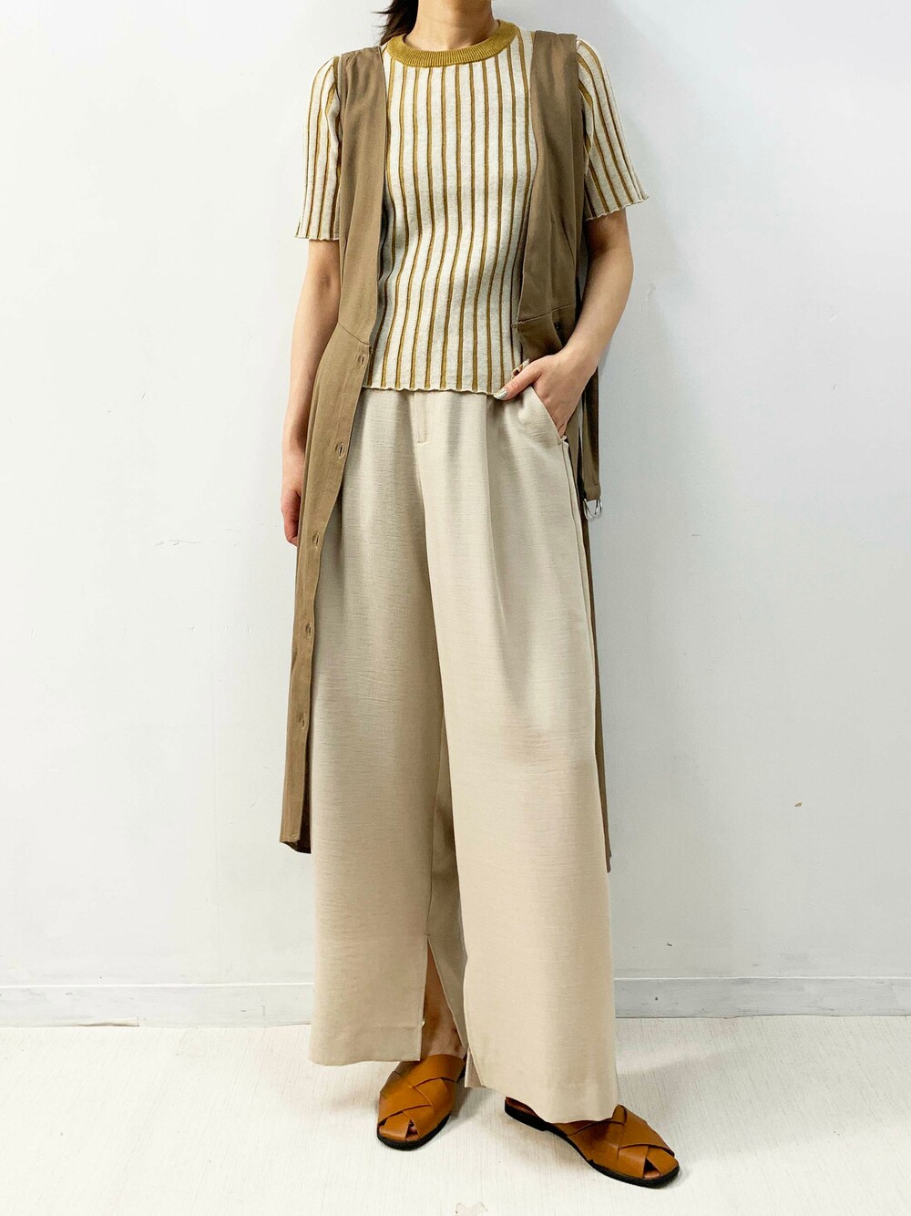 ナチュラルな風合いのジレ風コーデ♪ ジレは、 前回紹介したランダムな裾がポイントのワンピースを 前開きにしてジレ風にきてみました(^^) 襟ぐりが深いデザインだからジレにして着てもスッキリと着れるし、 ワンピースとはまた違った雰囲気が楽しめそうですね♪ リブトップスは新作でサラッとした質感と 色味がタイプで、密かに狙ってるアイテム...♡ 他にもトレンドアイテムやこれから使えるアイテム等幅広いテイストをご用意しておりますので、是非覗いてみてくださいね(*^^*)