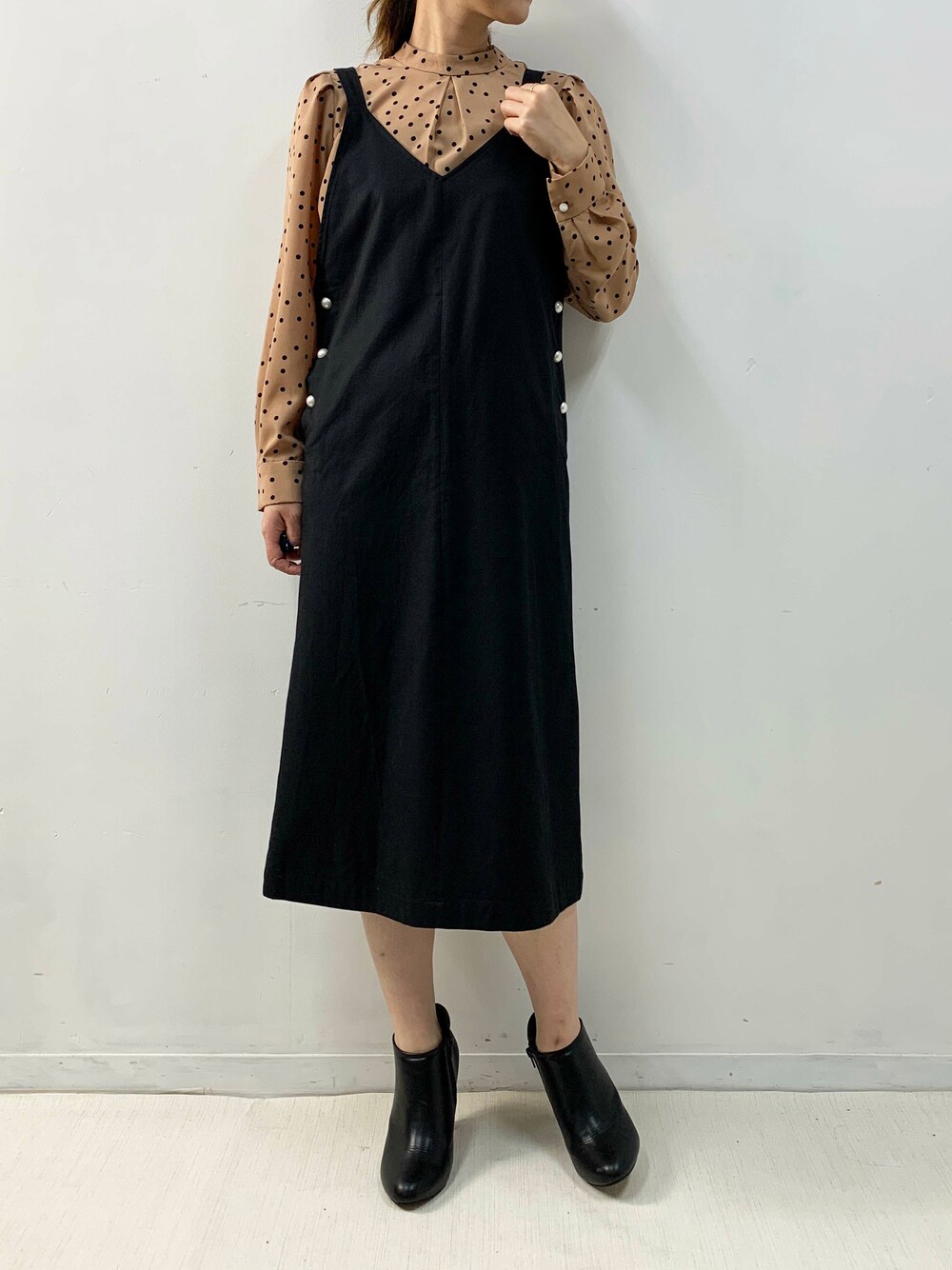 一枚でサマになるジャンパースカートコーデ♪ ジャンパースカートは、 ストンとしたシンプルなデザインにパールボタンが いいアクセントに♪ 肩ストラップの後ろはベルトタイプになってて、 後ろ姿も♡♡♡な一枚です(^^) ドットブラウスは、 スタンドネックと後ろボタンにパールがプラスされた何とも かわいいアイテムです♡ コーデの主役にピッタリなのでシンプルなボトム合わせでも オシャレUPが期待できますね♪♪ 他にもトレンドアイテムやこれから使えるアイテム等幅広いテイストをご用意しておりますので、是非覗いてみてくださいね(*^^*)