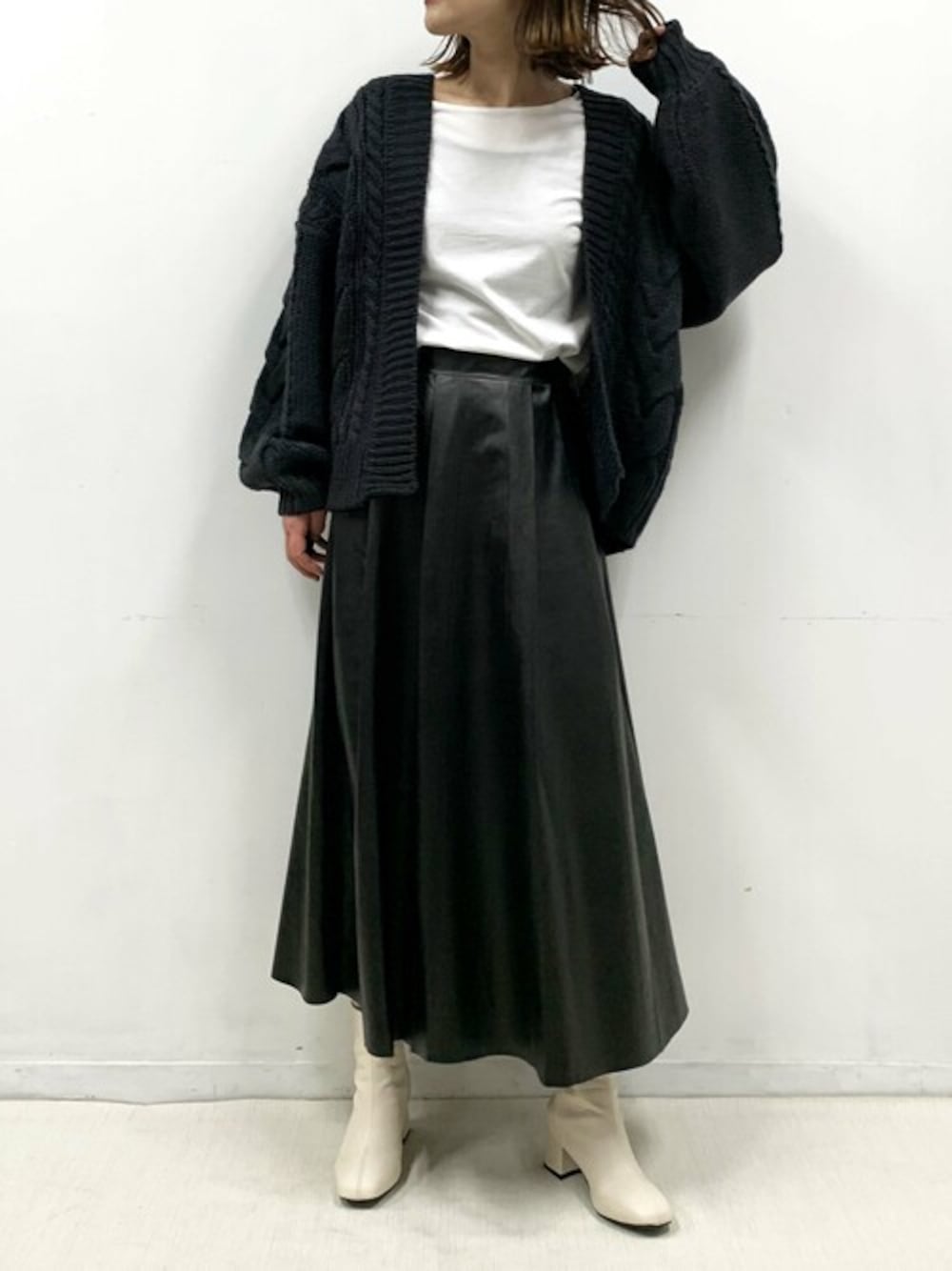 トレンドアイテムをあえてモノトーンで...♡ ざっくり編みのゆったりシルエットが可愛いカーディガンは、 袖のボリューム感や場所によって編地が違うのがポイント!! 後ろの襟ぐりはVラインになっていてスッキリと見せてくれるのも◎(^^) ロンTにサッと羽織るだけでこなれた雰囲気を出してくれるし、ワンピース、パンツ、スカートと アイテムを選ばずにカジュアルスタイルに重宝する1枚♡ スカートは今季1枚は持っておきたいレザーアイテム!! レザーならではの光沢感と風合いがたまらなくタイプ(´ε` )♡ フレアシルエットで強くなりすぎずに女性らしいラインなもの高POINTで、 シンプルコーデに取り入れるだけでも一気にシャレ感を引き出してくれる優秀アイテム!!! 他にもトレンドアイテムやこれから使えるアイテム等 幅広いテイストをご用意しておりますので、是非覗いてみてくださいね(*^^*)