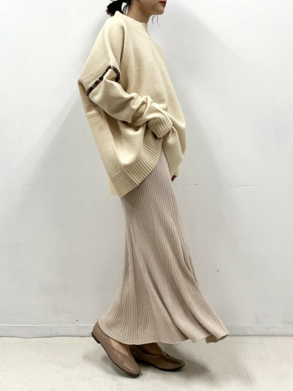 優しいカラーがポイントのクリーミーコーデ♪ トップスは今季トレンドの配色ステッチニット!! モチッと感とゆったりざっくりしたオーバーサイズなシルエットで 絶妙なボリュームが可愛すぎる♡♡ ズルっとルーズに着れて、1枚で今年らしいスタイルが叶う1枚(´ε` )♪ 見た目だけじゃなく温かさがあるのも高POINT!! スカートは裾にかけてヒラッと広がったシルエットが魅力のマーメイドスカート♪ 程よくオチ感があって美シルエット見えも◎◎ ニット生地でも、ちゃんと裏地も付いているから透ける心配がないのも嬉しい(^^) 他にもトレンドアイテムやこれから使えるアイテム等 幅広いテイストをご用意しておりますので、是非覗いてみてくださいね(*^^*)