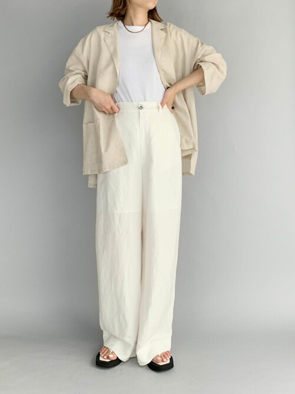爽やかにホワイトワントーンコーデ♪ Tシャツ+ゆるパンツにサッと羽織っただけのリネンジャケットは、 テーラードデザインなのにラフ感とヌケ感が出るお気に入りの一着♡ シンプルスタイルにはアクセサリーやトングサンダルなどの小物でアクセントをプラス!! 他にもトレンドアイテムやこれから使えるアイテム等幅広いテイストをご用意しておりますので、是非覗いてみてくださいね(*^^*)