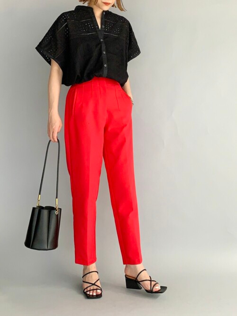 ブラック×レッドのポイントカラーコーデ♪ 場所によって違ったレース生地を使用したブラウスは、 デコルテ辺りが透け感のあるレースになっていて、 ブラックでも軽やかな印象にみせて見せてくれます。 ノーカラーデザインとシャツ風なBOXシルエットだから、 タンクやノースリの上から羽織りとしてもいいかも♡ ボタンを上まで留めてキチンと感のある着方や ボタンを開け後ろに若干抜いたスキッパー風な着方も◎ カラーパンツでアクセントスタイルも個人的に好み...♡ 他にもトレンドアイテムやこれから使えるアイテム等幅広いテイストをご用意しておりますので、是非覗いてみてくださいね(*^^*)