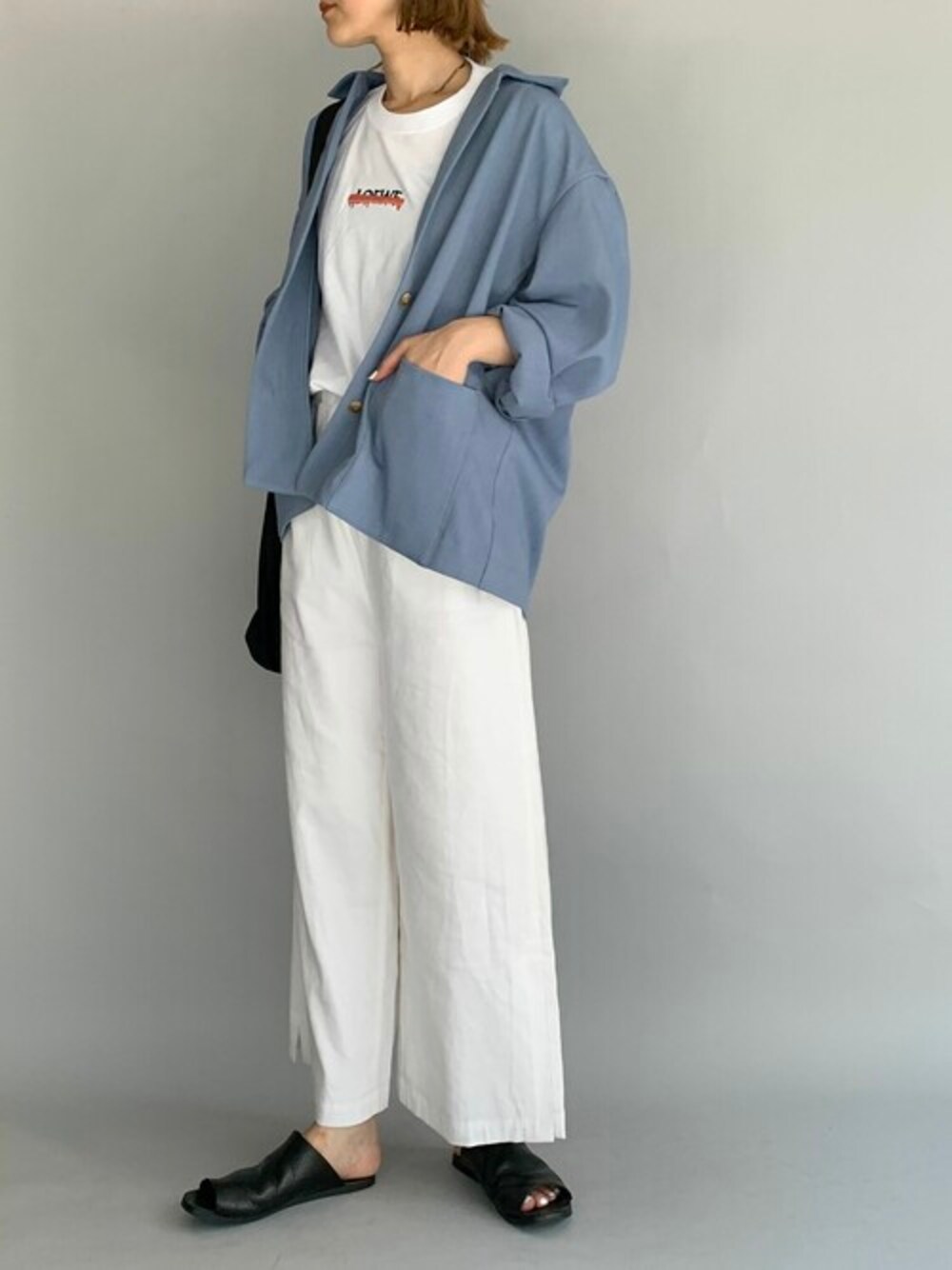 ラフな爽やかカラーコーデ♪ ガンガン着回しできるワンポイント刺繍のTシャツと白パンツの オールホワイトに柔らかブルーのゆったりシャツジャケットで爽やかさを♪ ラフにざっくりと着た感じが好き♡ 小物はブラックで統一して引き締めをプラス◎ 他にもトレンドアイテムやこれから使えるアイテム等幅広いテイストをご用意しておりますので、是非覗いてみてくださいね(*^^*)