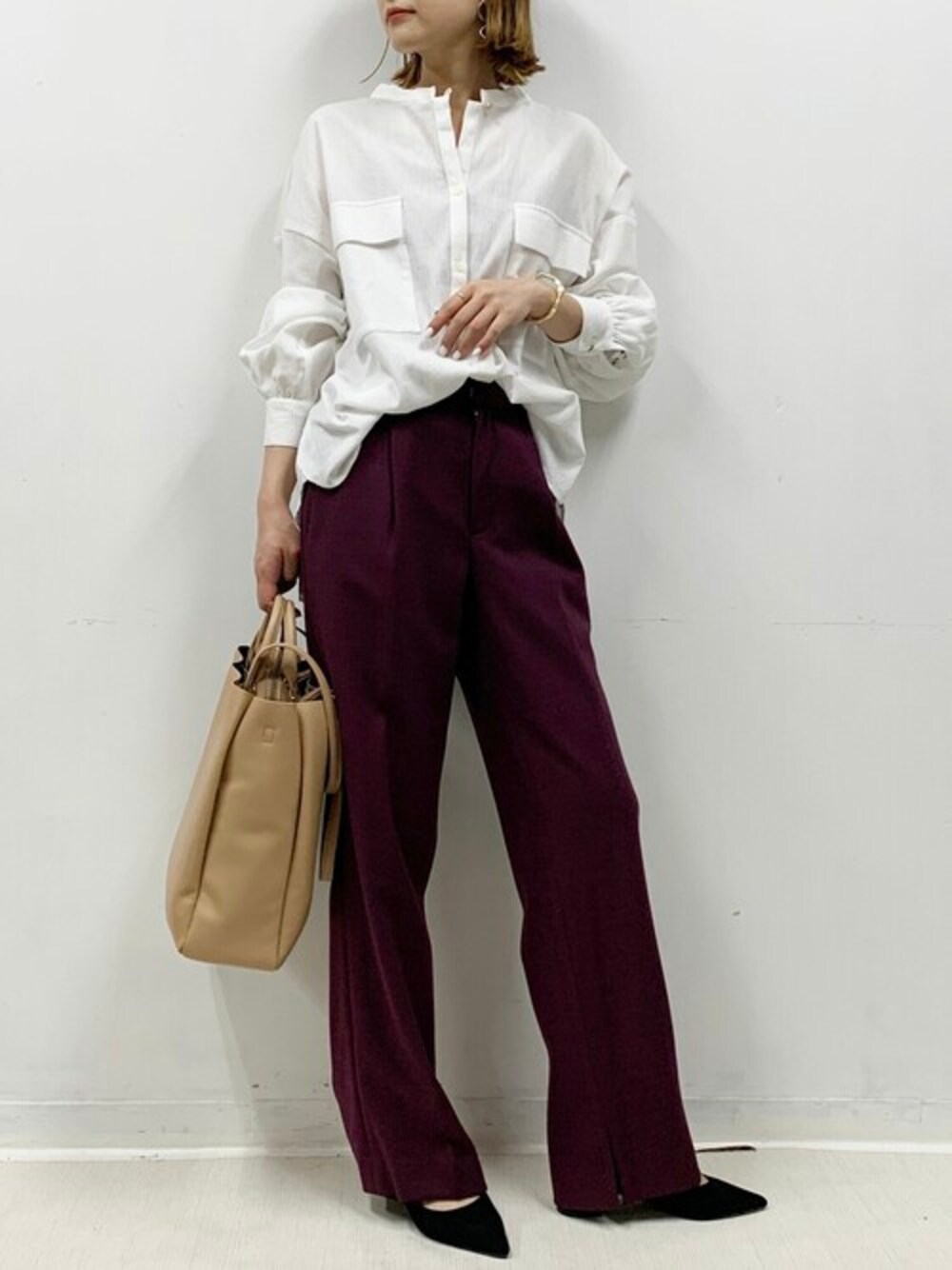 白シャツにスラックスでハンサムコーデ♪ 白シャツはシボ感のある生地でさらっとしてて 着心地抜群な今から秋にかけてのマストアイテム!! 今回は渋めのボルドーカラーのスラックス合わせでハンサムなスタイルに♪ デニムでカジュアルダウンにもいいし、羽織りにもいいし、 ボトム、小物次第で色んなアレンジが効きそう!! 他にもトレンドアイテムやこれから使えるアイテム等幅広いテイストをご用意しておりますので、是非覗いてみてくださいね(*^^*)
