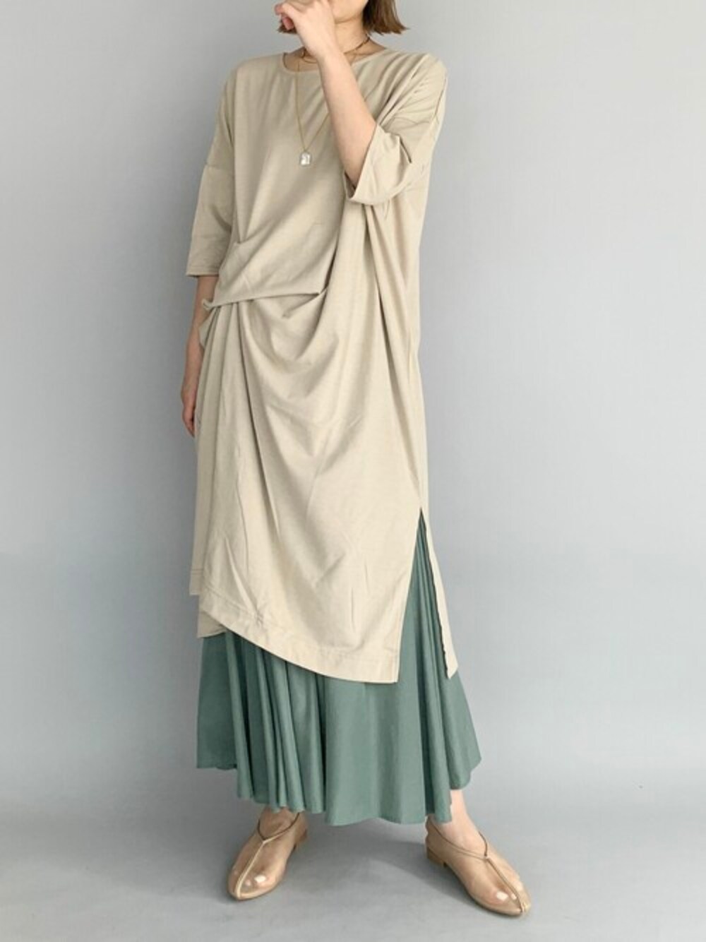ベージュ×モスグリーンの柔らかカラーコーデ♪ カットワンピースは何通りも着こなしアレンジが効く代物!!! 裏側のウエスト部分に紐が6本付いていて、 結ぶ位置によってそれぞれ違ったシルエットが遊べるのです♡♡♡ 今回はくすみ具合が絶妙に可愛いスカートとのレイヤードにしてみました♪ 柄やレース、サテン、リブ等々デザインのあるボトムと合わせると今年っぽいスタイルに...♡ 他にもトレンドアイテムやこれから使えるアイテム等幅広いテイストをご用意しておりますので、是非覗いてみてくださいね(*^^*)