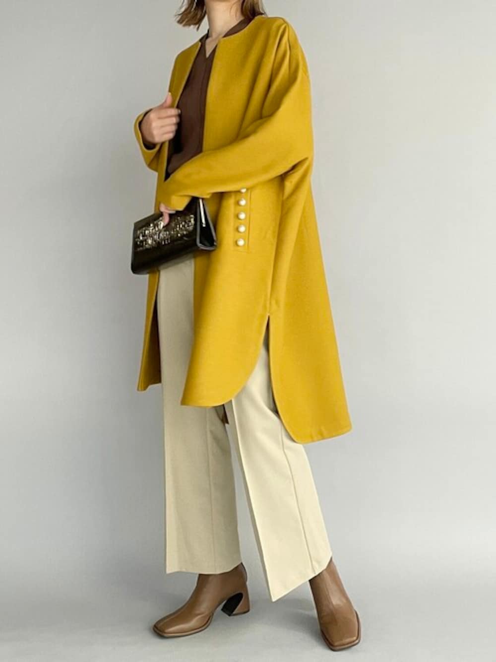 マスタード×パールのノーカラーコートコーデ♪ ポケットのパールボタンがポイントのコートは、 ドロップショルダーにゆったりとしたサイズ感が◎ 何といってもありそうでないマスタードカラーがめちゃくちゃ可愛いー♡ 秋冬のコーデもこれ一枚でパーッと明るく華やかになる事間違いなし!!! ブラウン、ブラック系のアイテムとの相性はもちろん良いけど、 グレー、ネイビー、グリーンとか今年はカラー合わせも良いかも♪ 他にもトレンドアイテムやこれから使えるアイテム等幅広いテイストをご用意しておりますので、是非覗いてみてくださいね(*^^*)