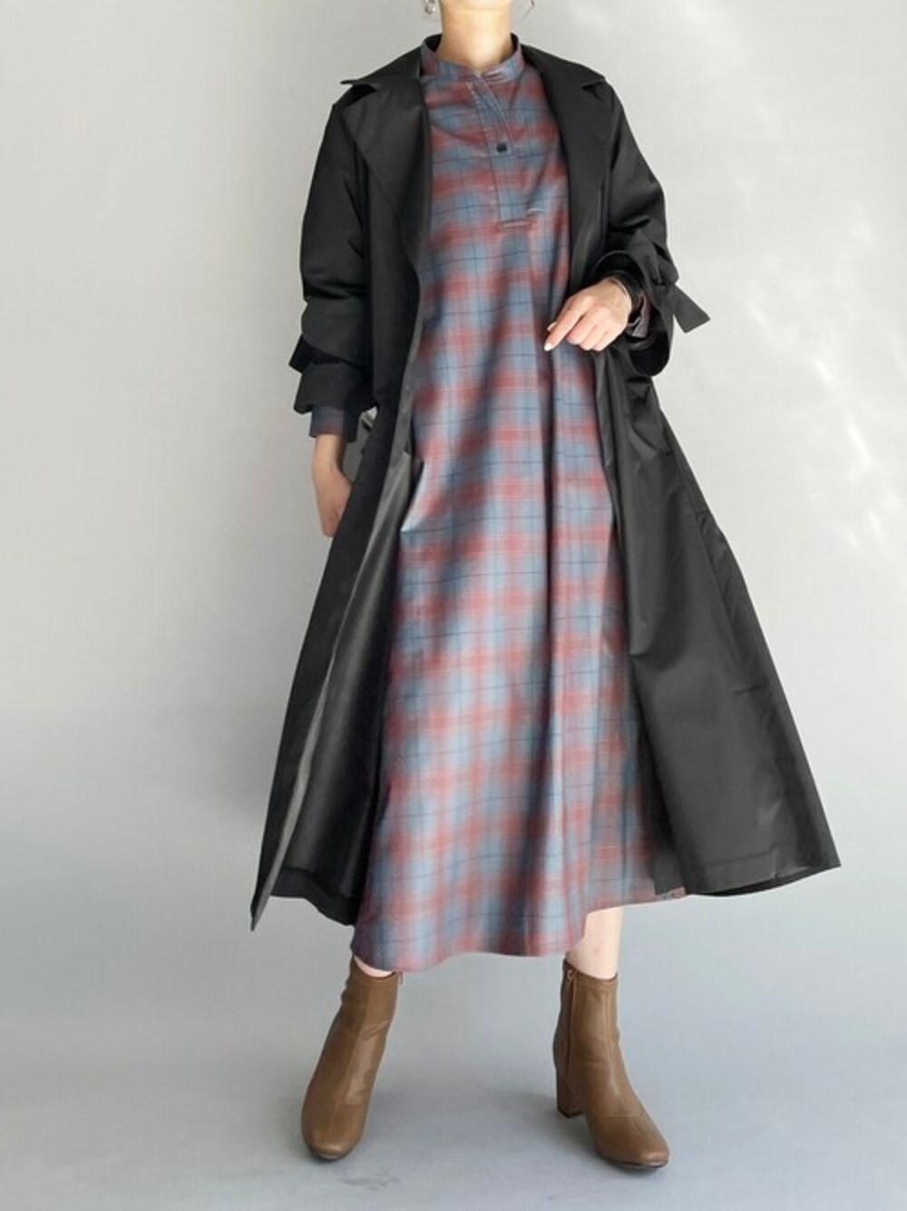 落ち着いた大人のチェックワンピーススタイル♪ ありそうでなかなか無いこのくすんだような落ち着いた色味がタイプ♡ Aラインのシルエット+スキッパーデザインでスタイルよく見せてくれるのも高ポイント!!♡ 全体的にボヤっとならないようにブラックアウターでキリっと!! 他にもトレンドアイテムやこれから使えるアイテム等幅広いテイストをご用意しておりますので、是非覗いてみてくださいね(*^^*)