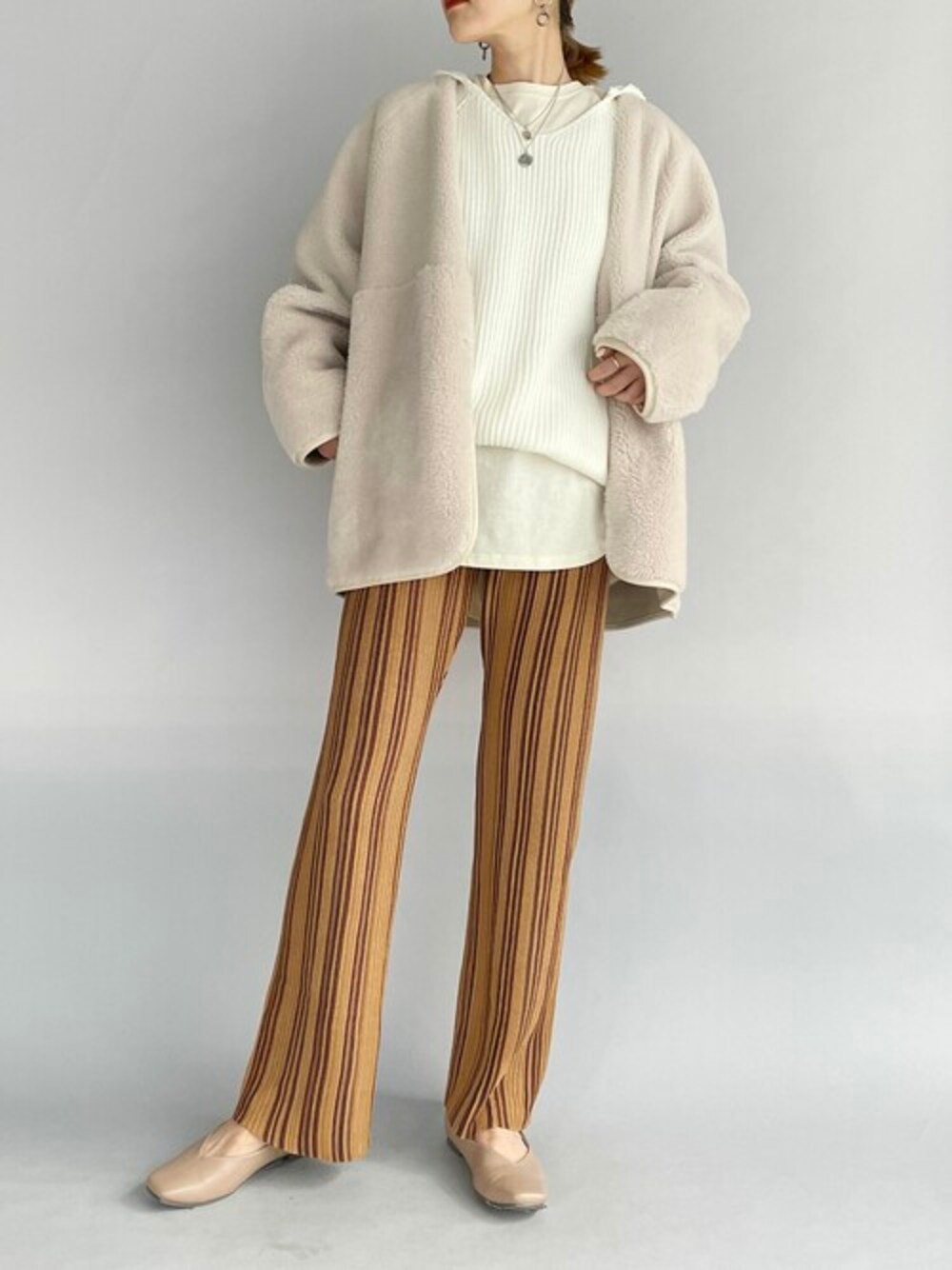 モコモコボアコートスタイル♪ 見た目も温かでモコモコ可愛いボアと品のあるキレイ目にもピッタリなスエードの リバーシブルで使える優秀アウター!!!! そろそろアウターが欲しくなる季節で候補の一つ♡ ノーカラーだからフードアイテムとも相性◎だし、サッと一枚羽織るだけでも 一気に今っぽいスタイルが完成♡ 今回はフードニット+Tシャツにマルチストライプのリブパンツ合わせで♪ 他にもトレンドアイテムやこれから使えるアイテム等幅広いテイストをご用意しておりますので、是非覗いてみてくださいね(*^^*)