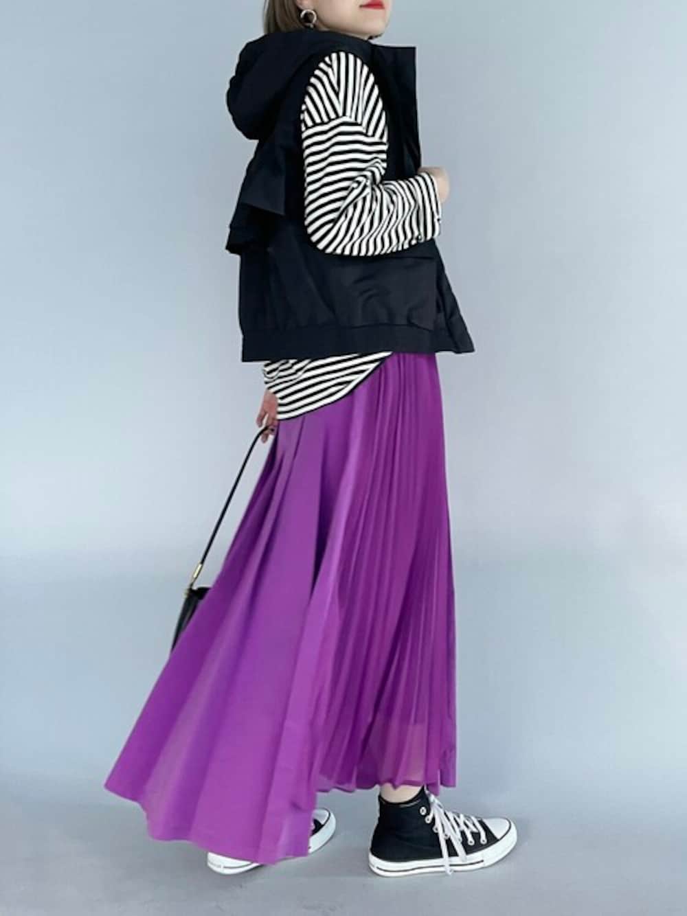 バックコンシャスな中綿ベストスタイル♪ コンパクトなサイズ感と丁度いいスポーティーな感じが♡♡♡ 後ろが立体的なフリルデザインになっていてバックスタイルも可愛い~◎♡ 普段フリルアイテムを着ない私でもこれならチャレンジしやすい!!!! 今回は、ボーダーカットソー+アクセントにカラースカート+スニーカーで♪♪ 他にもトレンドアイテムやこれから使えるアイテム等幅広いテイストをご用意しておりますので、是非覗いてみてくださいね(*^^*)
